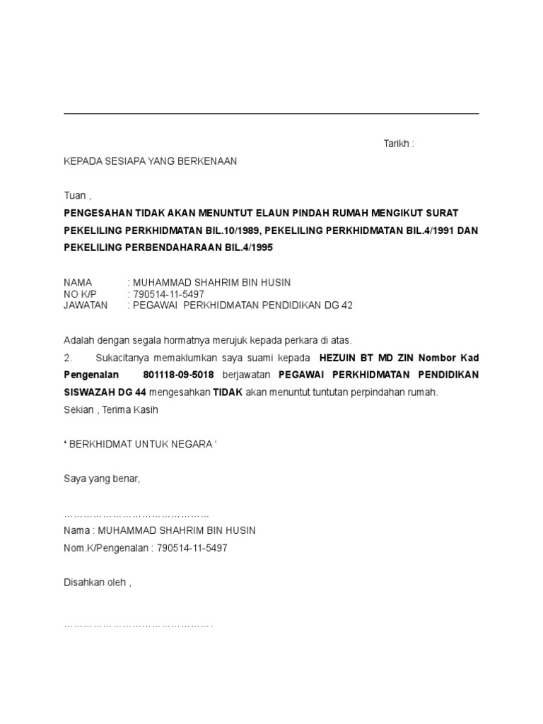 CONTOH SURAT PERNYATAAN PENYERAHAN RUMAH. Wp12 kadar dan syarat tuntutan elaun kemudahan. CONTOH SURAT KEBENARAN DARI PEMILIK.